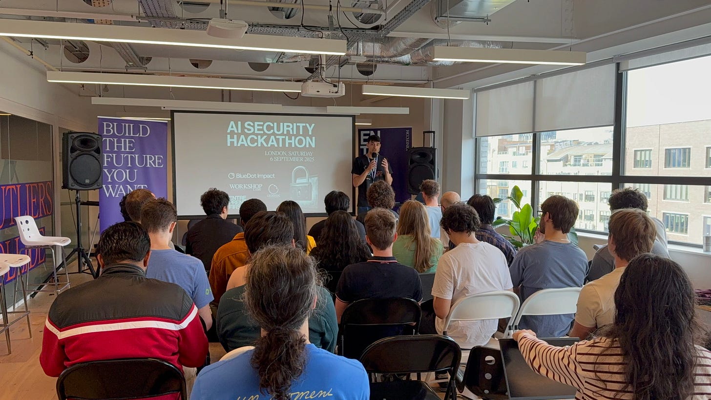 For the last 3 months, we (Prince and Josh) have both been interning at Entrepreneurs First (EF), a company that helps talented people build startups from scratch. In our penultimate week, we ran an AI Security Hackathon alongside BlueDot Impact, with sponsorship from Workshop Labs and Geodesic Research. It was a big success!